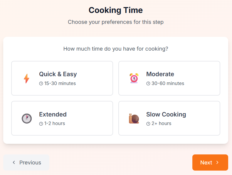 Select the amount of time you have available to prepare and cook the recipes that the Maison Foodie chef will find and create for you. This step is optional. Click "Next" to proceed to the next step.