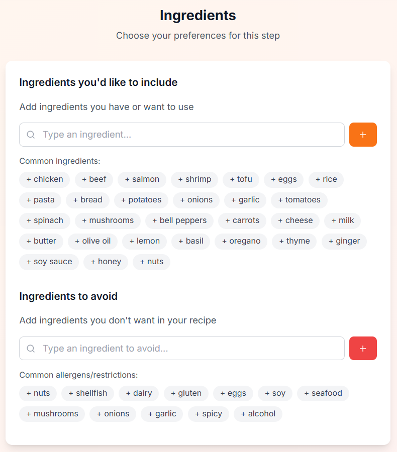 Please select the ingredients that you would like to include or exclude from the recipes that the Maison Foodie chef will find an create for you. Use the "Custom" fields to (i) add ingredients that you would like to include in the recipes; and/or (ii) to exclude ingredients that you do not want to be included in the recipes being created for you. This step is optional. **WHILE THE MAISON FOODIE CHEF WILL TRY ITS BEST TO ACCOMODATE ANY INGREDIENTS THAT YOU HAVE SELECTED TO BE EXCLUDED FROM THE RECIPES BEING GENERATED, THE MAISON FOODIE CHEF CANNOT GUARANTEE THAT THE RECIPES GENERATED WILL EXCLUDE ANY IDENTIFIED INGREDIENTS OR ACCOMODATE ANY DIETARY RESTRICTIONS. IF YOU HAVE ANY FOOD ALLERGIES OR DIETARY PREFERENCES, YOU SHOULD VERIFY ANY INGREDIENTS IDENTIFIED IN THE RECIPES PRIOR TO ANY USE OR RELIANCE OF THE RECIPES GENERATED AND PROVIDED TO YOU.