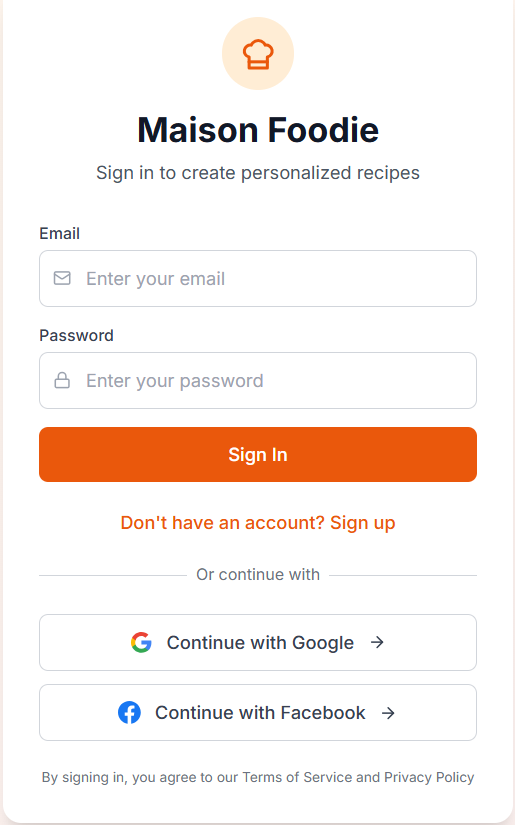 Click on "LET'S START" in the menu . You can sign up with either your Google account or your Facebook account. Alternatively, you can register with Maison Foodie and create your own account by clicking "Sign Up". Registering for a Maison Foodie account is required so that you can view past recipes that the Maison Foodie chef has created for you and to access other premium features (coming soon!).