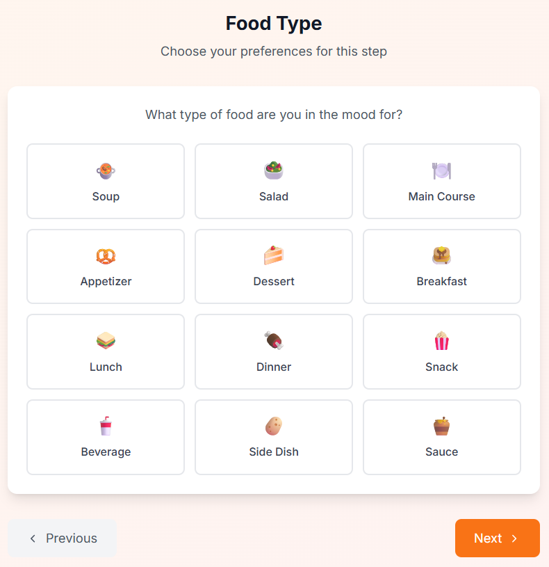 Select from a predetermine list of recipe types or use the "Custom" field and enter the type of recipe that you would like the Maison Foodie chef to find and create for you.
