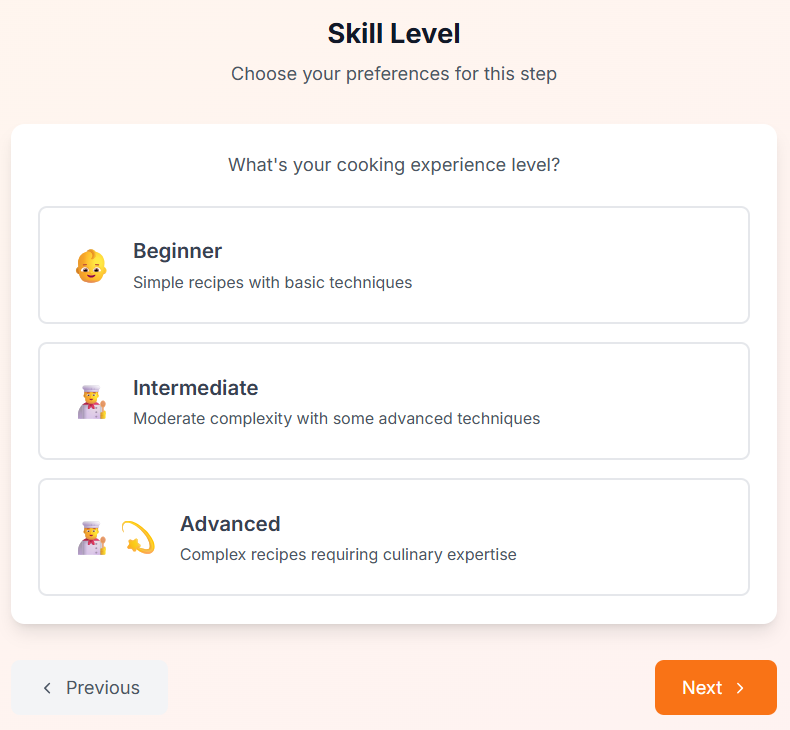 Select the level of cooking skill. This will help determine the complexity of the recipe that the Maison Foodie chef will find and create for you. This step is optional. Click "Next" to proceed to the next step.