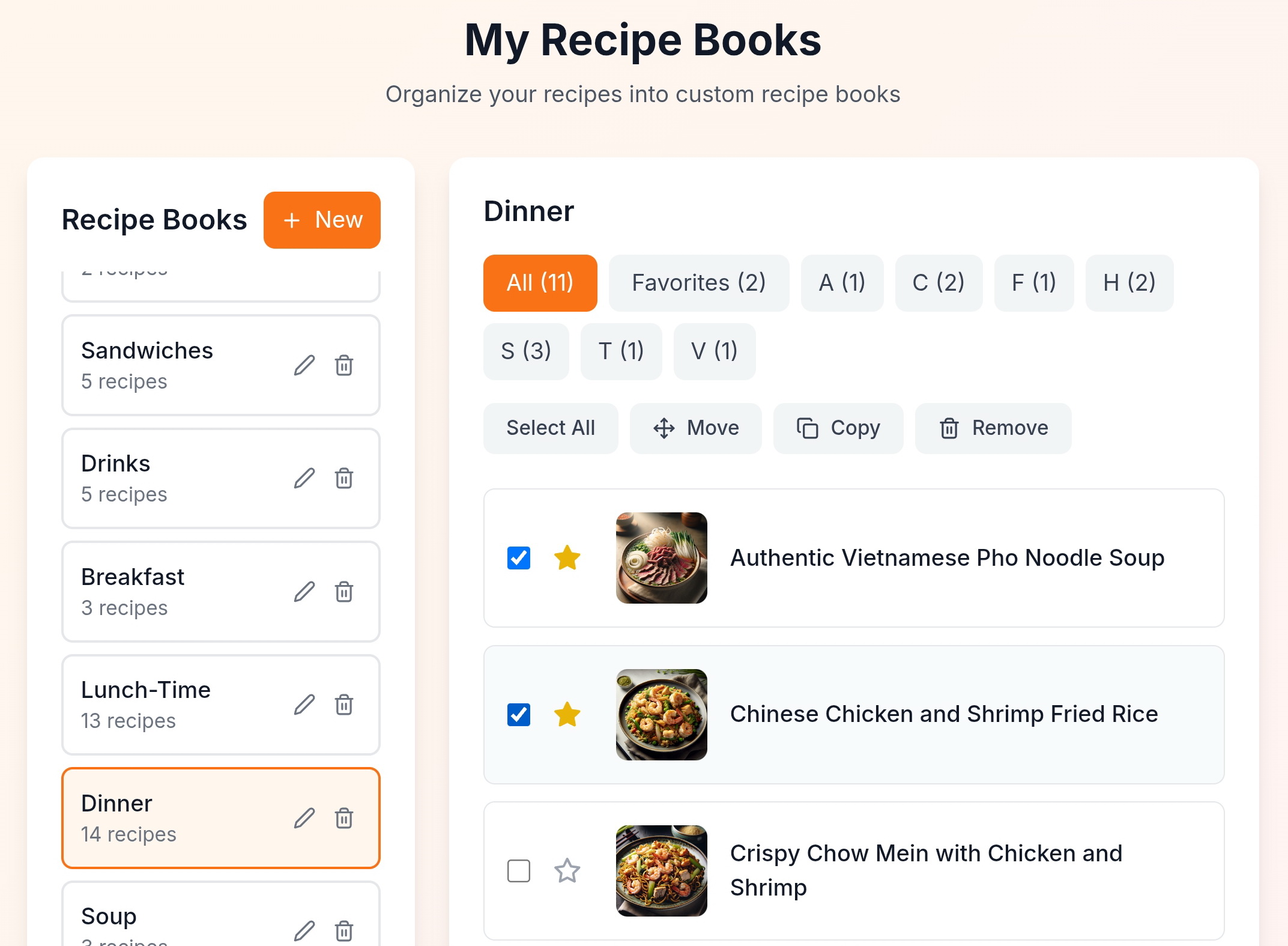 Recipe Books “bulk-action” tools allow you to select one or multiple recipes to either “Move” those recipes to another Recipe Book, “Copy” those recipes to another Recipe Book or multiple other Recipe Books, or “Remove” the selected recipes from the Recipe Book. Select the recipe of your choice and click on the applicable recipe management option button. Removing recipes from a Recipe Book will not remove/delete the recipe from the Maison Foodie community. Any recipes, whether created by you or by any other fellow foodie, that can be discovered in the Maison Foodie community can be easily and quickly added to any Recipe Book.