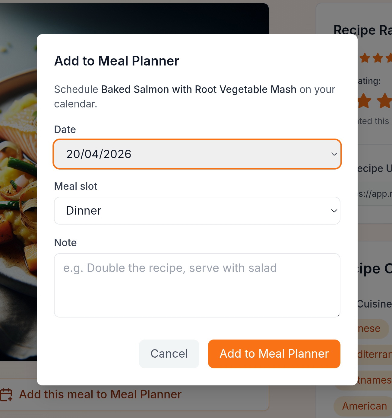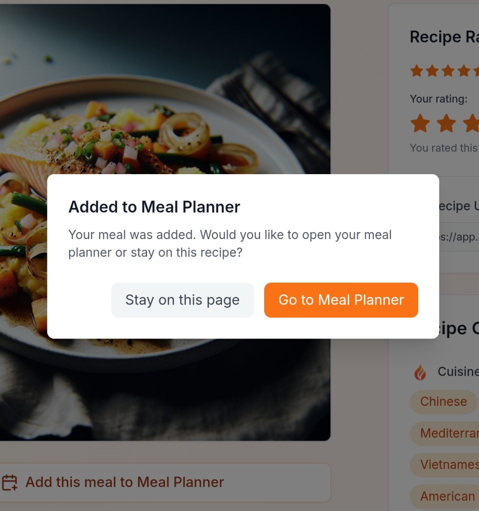 Maison Foodie allows you to quickly manage and organize all of your Meal Plans. Edit any Meal Plan, add preparation, cooking, or other “Notes”, add the same recipe to multiple days, or remove your meal plans with just a few clicks.