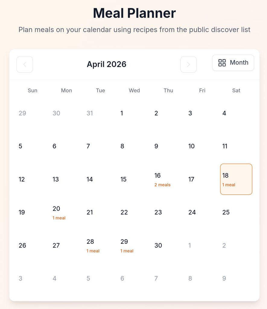 Get a full calendar view of all your Maison Foodie Meal Plans for the month. Instantly spot which days are already planned and dive into any day, week, or month to see the details that matter.